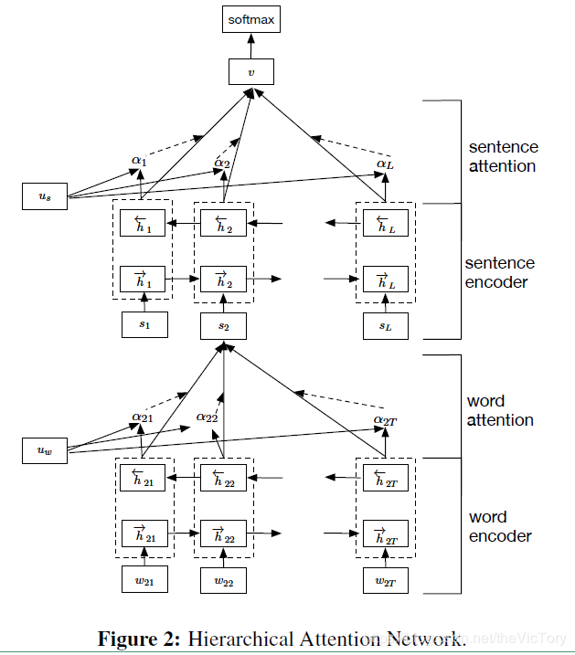 另一个文本分类模型就是HAN(Hierarchy Attention Network),首先将文本分为句子、词语级别,将输入的词语进行编码然后相加得到句子的编码,然后再将句子编码相加得到最后的文本编码。而attention是指在每一个级别的编码进行累加前,加入一个加权值,根据不同的权值对编码进行累加。
