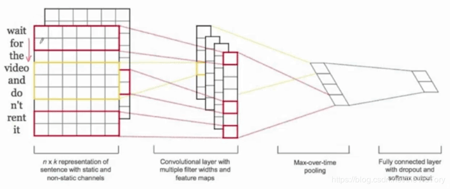 可以看到CNN网络不能完美处理输入长短不一的序列式问题,但是它可以并行处理多个词组,效率更高,而RNN可以更好地处理序列式的输入,将两者的优势结合起来就构成了R-CNN模型。首先通过双向RNN网络对输入进行特征提取,再使用CNN进一步提取,之后通过池化层将每一步的特征融合在一起,最后经过全连接层进行分类。