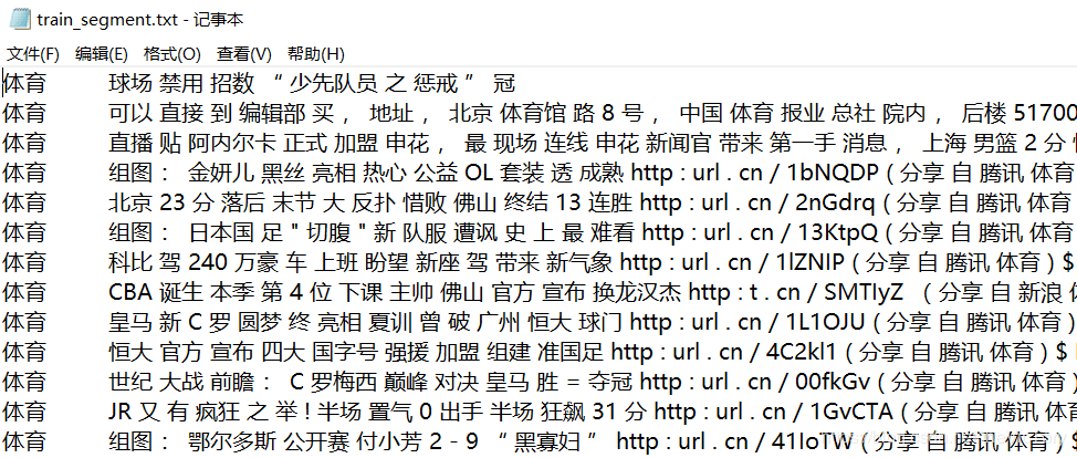 通过os.walk遍历所有训练集文件,将分类文本通过jieba库拆分成单个词组,用空格分隔。然后将分类文本添加到开头,并用制表符分隔,最后将结果输出到train_segment.txt,