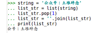 string = '公众号:土堆碎念' list_str = list(string) list_str.pop(1) list_str = ''.join(list_str) print(list_str)