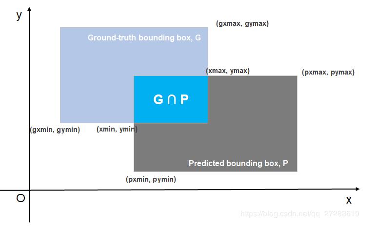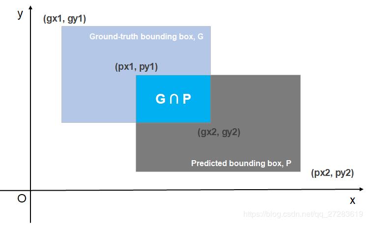 假设平面坐标中有两个矩形:原标记框(Ground-truth bounding box, G)和预测框(Predicted bounding box, P),其中G为手动标记的框,P为算法预测的框,并且这两个矩形的长和宽均分别与x轴和y轴平行。如下图所示: