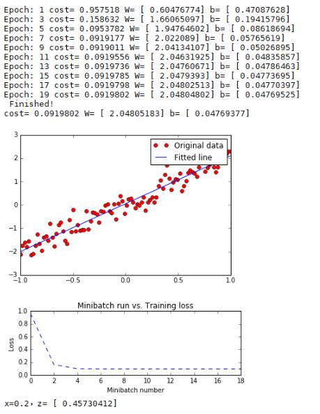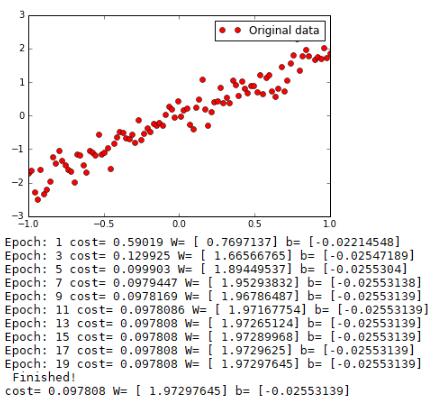 print ("Epoch:", epoch+1, "cost=", loss,"W=", sess.run(W), "b=", sess.run(b))