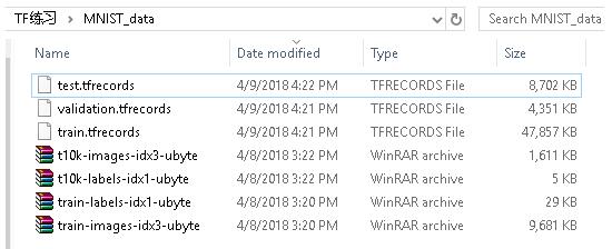 上面程序可以将MNIST数据集中所有的训练数据存储到三个TFRecord文件中。结果如下图