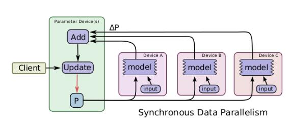 一个简单的加速训练的技术是并行地计算梯度,然后更新相应的参数。数据并行又可以根据其更新参数的方式分为同步数据并行和异步数据并行,同步的数据并行方式如图所示,tensorflow图有着很多的部分图模型计算副本,单一的客户端线程驱动整个训练图,来自不同的设备的数据需要进行同步更新。这种方式在实现时,主要的限制就是每一次更新都是同步的,其整体计算时间取决于性能最差的那个设备。