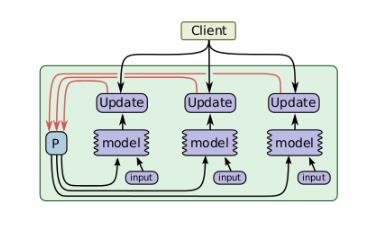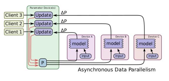 数据并行还有异步的实现方式,如图所示,与同步方式不同的是,在处理来自不同设备的数据更新时进行异步更新,不同设备之间互不影响,对于每一个图副本都有一个单独的客户端线程与其对应。在这样的实现方式下,即使有部分设备性能特别差甚至中途退出训练,对训练结果和训练效率都不会造成太大影响。但是由于设备间互不影响,所以在更新参数时可能其他设备已经更好的更新过了,所以会造成参数的抖动,但是整体的趋势是向着最好的结果进行的。所以说这种方式更适用于数据量大,更新次数多的情况。