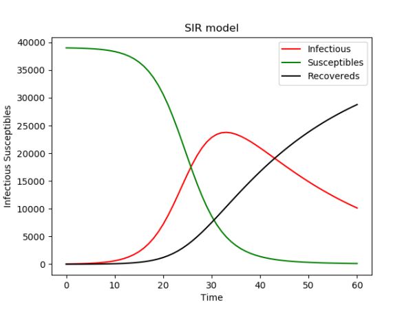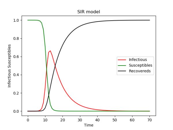 采用SIR模型,S代表易感者,I表示感染者,R表示恢复者。染病人群为传染源,通过一定几率把传染病传给易感人群,ta自己也有一定的几率被治愈并免疫,或死亡。易感人群一旦感染即成为新的传染源。