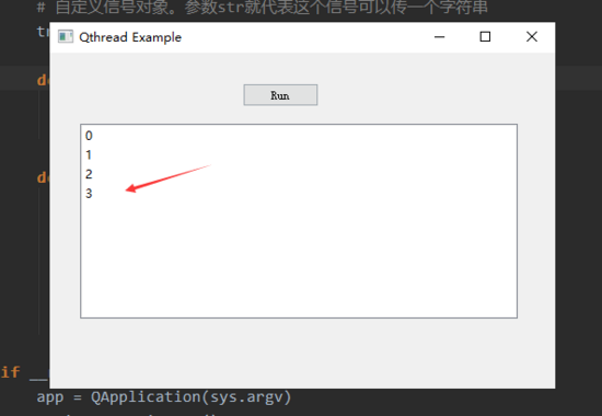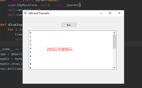 使用PyQt界面程序,点击运行按钮后,程序在显示框中每秒打印1个数字。程序代码如下: