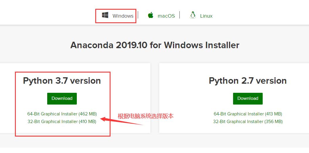 步骤一:进入官网(https://www.anaconda.com/download/#windows)下载对应正确的版本,这里选择的是Windows 64bit;