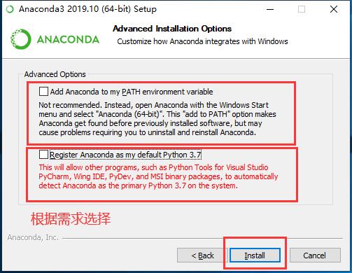 B.如果想使Anoconda 作为独立于其他软件和操作系统的 Python IDE平台,则不勾选此项.其他软件和操作系统对 Python 外部包的管理与Anoconda 相互无关.conda、jupyter、ipython需在Anoconda Shell 中打开.