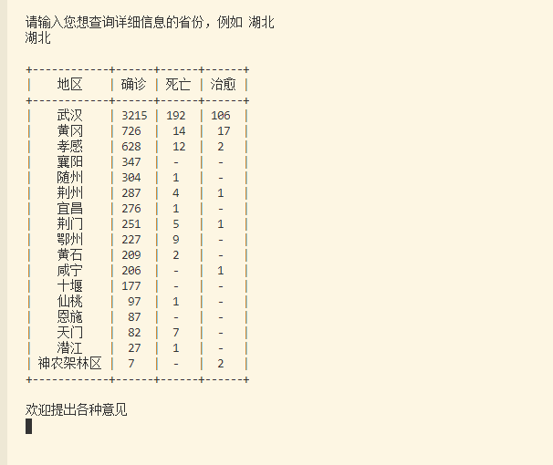 key = input("请输入您想查询详细信息的省份,例如 湖北\n")