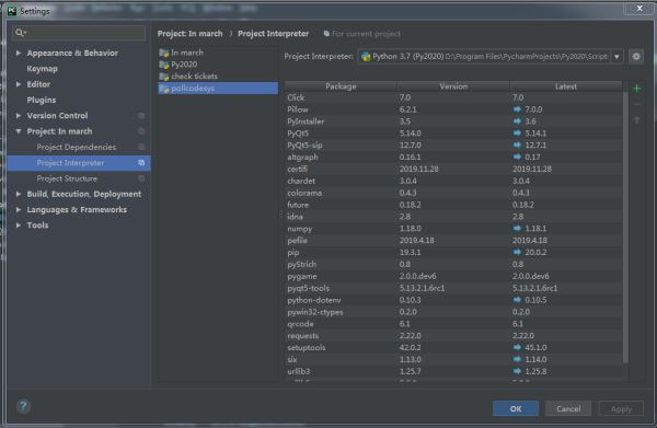 在Python的开发工具PyCharm中安装QtPy5(版本5):打开“File”——“Settings”——“Project Interpreter”,点击窗口中右侧点添加按钮,然后在弹出的窗口添加PyQt5模块包,单击Install Package按钮,如图所示: