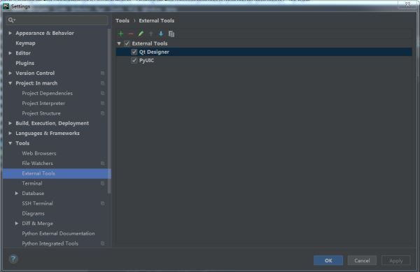 安装好PyQt5模块包好后,在开发工具PyCharm中配置PyQt5工具(该配置主要有两个作用,一个是用来在开发工具PyCharm中能直接启动QT,一个是在开发工具PyCharm中将QT的.ui文件转换.py文件):在开发工具PyCharm打开“File”——“Settings”——“Tools”——“External Tools”在右侧单击添加按钮,如下图所示: