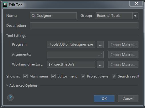 配置好Qt Designer的快捷工具后,根据同样的方法,添加将QT生成的ui文件转换为py文件的快捷工具,在Name所对应的编辑框中填写工具名称为PyUIC,然后在Program所对应的编辑框中填写Python的安装路径,再在Arguments所对应的编辑框中填写将ui文件转换为py文件的Python代码(-m PyQt5.uic.pyuic $FileName$ -o $FileNameWithoutExtension$.py),在Working directory所对应的编辑框中填写$FileDir$,该值为文件目录,单击OK按钮即可,如下图所示(注意:在Program所对应的编辑框中填写自己的Python安装路径,记得尾部需要填写python.exe),如下图所示: