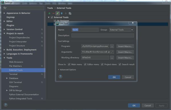 配置PyCharm中将QT的.ui文件转换.py文件: