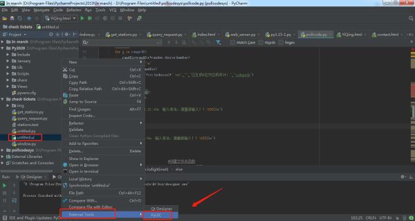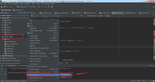 在PyCharm需要启动PyQt5的项目中点击鼠标右键,“External Tools”——“Qt Designer”(刚才在PyCharm配置的名字)即可,如下图: