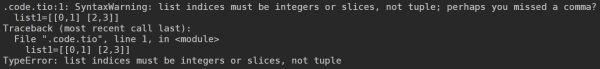 list1=[[0,1] [2,3]] #这将给出缺少逗号和TypeError的SyntaxWarning。