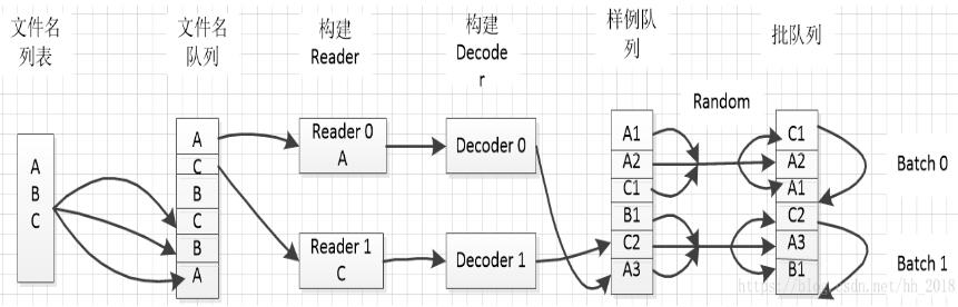 样例队列的创建方式是隐式的,一般在图中为了计算任务顺利的输入数据,我们一般使用tf.train.start_queue_runners方法启动所有的入队操作所需的线程,此时会自动执行所有的文件名入队操作和文件名队列的操作,执行样例队列入队和样例队列的操作。这些都是在后台产生的。