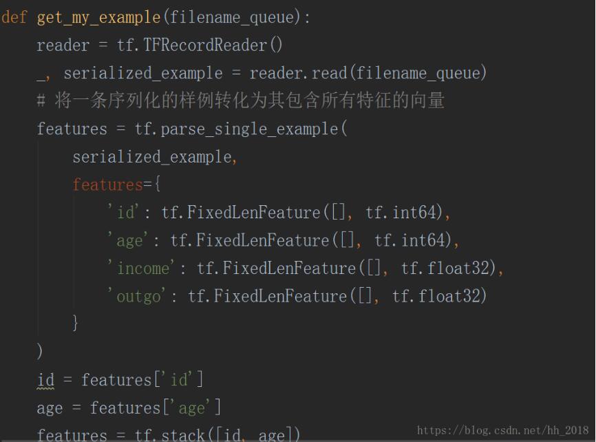 TFRecoder是tensorflow标准的输入格式,它是通过protocolBuffer构建的存储数据记录的结构。该数据结构分明,一个样例中包含一组特征Features,一个Features又包含多个特征向量feature。其在读取的时候主要使用tf.TFRecoderReader的方法构建Reader,在使用read的方法读出元组。接着对元组中的value采用tf.parse_single_example()方法进行解析。再解析的时候需要传入features参数,该参数要和构造该文件时输入的字典型变量保持一致(key,value)。key和输入的key一致,value是一个表示该key对应的维度和类型的定西,用tf.FixedLenFeature函数构造,该函数传入参数表示特征形状和特征值的类型。具体如下: