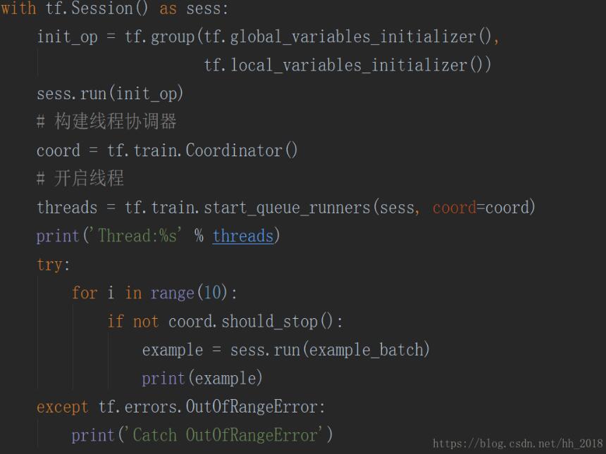 并行读取数据离不开多线程操作,多线程操作离不开线程调节器。tensorflow使用tf.train.Coordinatior方法创建管理多线程生命周期的调节器。调节器的工作原理比较简单,它监控Tensoflow后台的所有线程,当某一个线程出现异常时,它的should_stop方法返回true,最后调用request_stop终止所有的线程。但是要注意我们在使用线程调节器之前一定要调用tf.local_variables_initializer方法进行初始化。