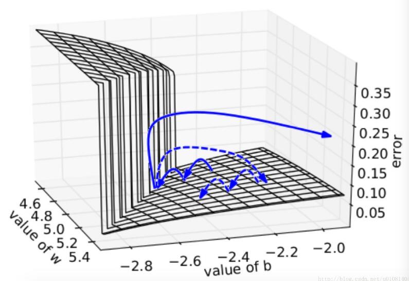 在一个只有一个隐藏节点的网络中,损失函数和权值w偏置b构成error surface,其中有一堵墙,如下所示