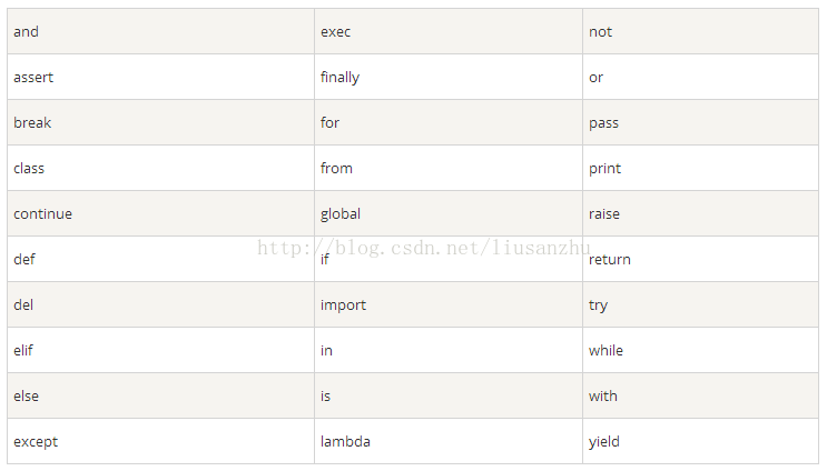 下面的列表显示了在Python中的保留字。这些保留字不能用作常数或变数,或任何其他标识符名称。