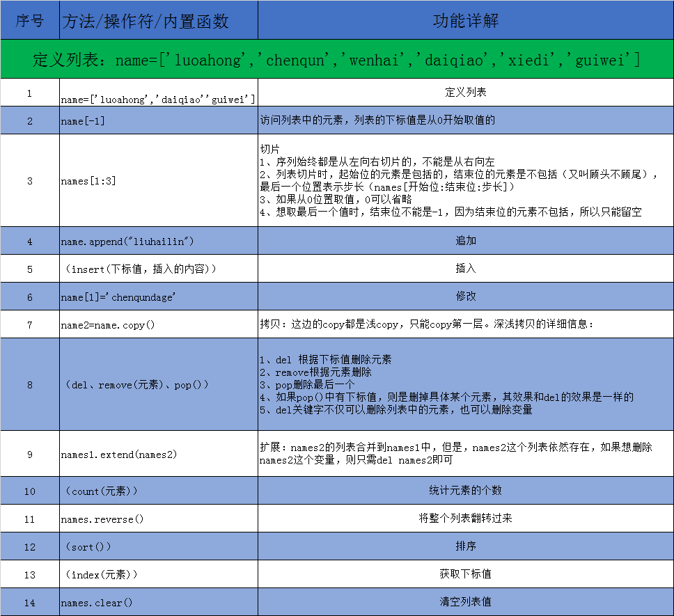 ①列表切片时,起始位的元素是包括的,结束位的元素是不包括(又叫顾头不顾尾),最后一个位置表示步长(names[开始位:结束位:步长])