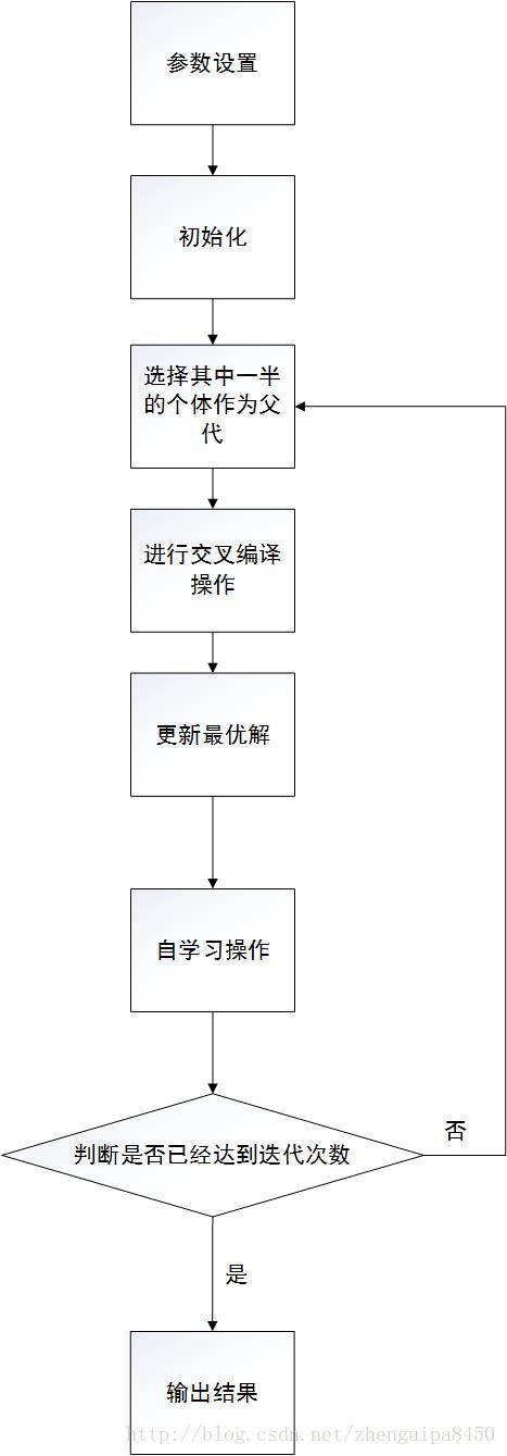 设计的程序主要分为以下步骤:1、参数设置;2、种群初始化;3、用轮盘赌方法选择其中一半较好的个体作为父代;4、交叉和变异;5、更新最优解;6、对最有个体进行自学习操作;7结果输出。其算法流程图为: