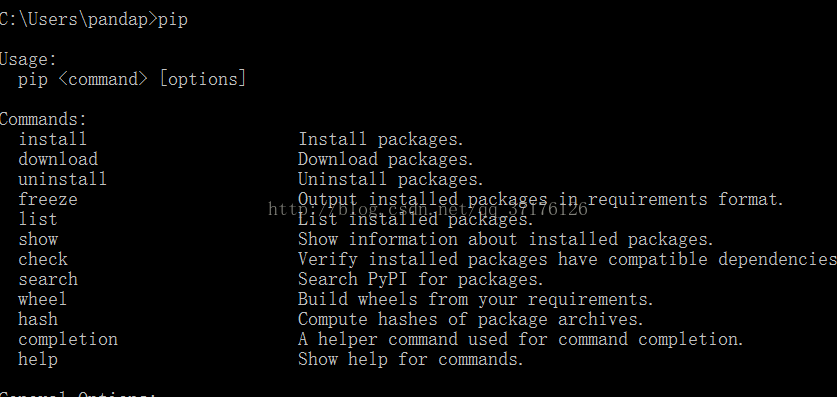 在cmd 下输入 pip 若显示 如图 相关信息,表示安装成功