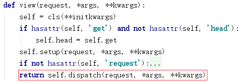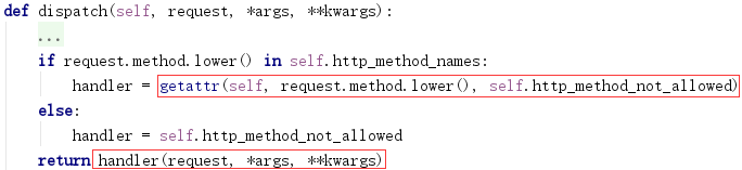 dispatch按请求方式反射到对应的请求方法,getattr去self(视图类)找get或者post方法并返回.