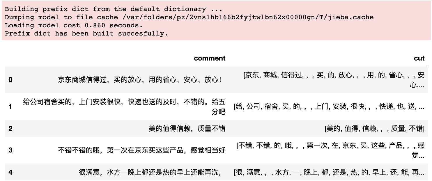 data['cut'] = data['comment'].apply(lambda x : list(jieba.cut(x))) data.head() print(data['cut'].loc[14])