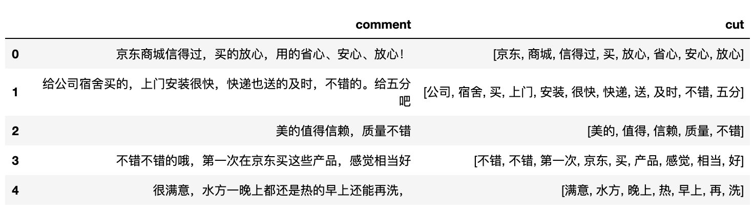 # 生成分词 data['cut'] = data['comment'].apply(lambda x : list(jieba.cut(x))) data.head()