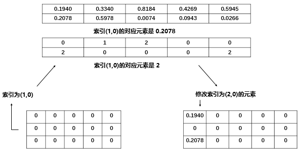 具体地说,我们的 index 是torch.tensor([[0, 1, 2, 0, 0], [2, 0, 0, 1, 2]]),一个二维张量,下面用图简单说明