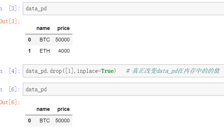 从上图中可以看到:我们对data_pd做了删除一行的操作,但是这并没有改变变量data_pd在内存中的值,而是将删减一行后的数据放置在一块新开辟的内存区域。