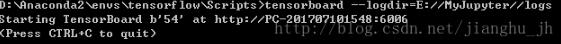 通过cmd进入系统命令模式,由于我的Tensorboard没有导入系统环境变量中,所以必须将目录cd到tensorflow中的scripts文件夹,执行里面的tensorboard.exe