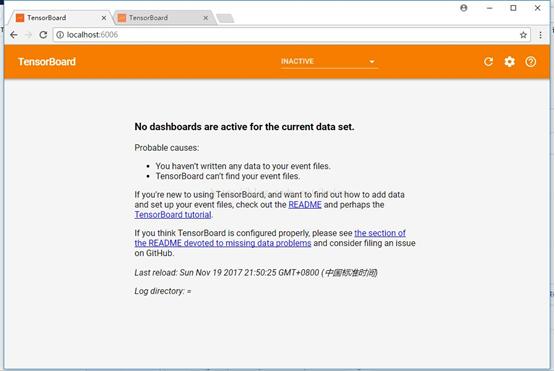 问 题:直接载入TensorBoard 总是提示No dashboard are active for current data set.根本不显示计算图。