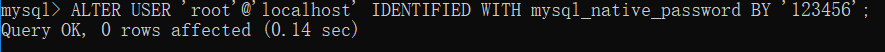 然后输入ALTER USER 'root'@'localhost' IDENTIFIED WITH mysql_native_password BY '123456';