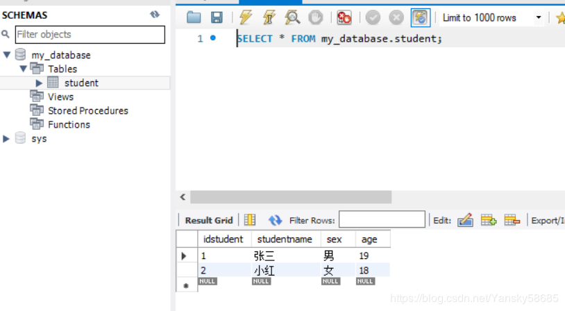 # 导入pymysql模块 import pymysql # 连接database conn = pymysql.Connect( host='localhost',#你的数据库地址 port=3306,#端口号 user='root',#用户名 passwd='123456',#密码 db='my_database',#数据库名 charset='utf8') # 得到一个可以执行SQL语句的光标对象 cursor = conn.cursor() # 定义要执行的SQL语句 sql = 'select * from student' # 执行SQL语句 cursor.execute(sql) #打印执行结果 print(cursor.fetchall()) # 关闭光标对象 cursor.close() # 关闭数据库连接 conn.close()