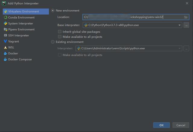 2,在pycharm打开项目代码,依次打开“File—>Settings—>Project Interpreter—>选择右侧的Project Interpreter:文本框中的“show all”—>选择Project Interpreters窗体中的 +—>基于第1步中安装的两版本python分别在项目代码下建立两个虚拟运行环境目录:venv-win32和venv-win64