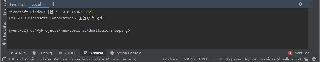 3,虚拟运行环境配置完毕后,轮次启用虚拟运行环境,然后在pycharm的Terminal窗口中pip install 所有需要的模块。
