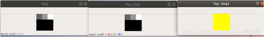 以上是单通道的效果,接下来将上图转化为3通道BGR图 ,每一个像素点由一个三元数组表示。其中bgr_img[]0,0,0]表示第一行(y)第一列(x)B通道的值;bgr_img[100,200,1]表示第101行(y)第201列(x)G通道的值。