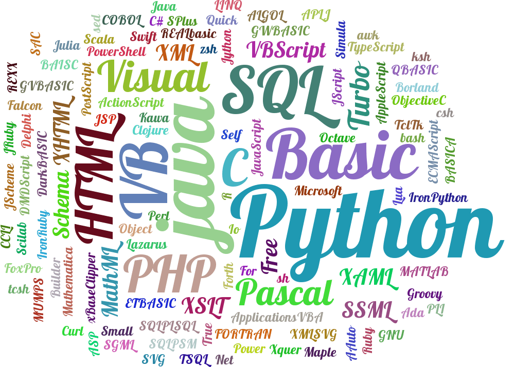 ['BAISC', 'Python', 'BASICA', 'GVBASIC', 'GWBASIC', 'Python', 'ETBASIC', 'QBASIC', 'Quick', 'Basic', 'Turbo', 'Basic', 'True', 'Python', 'java', 'Basic', 'Visual', 'Basic', 'Visual', 'Basic', 'Net', 'Power', 'Basic', 'Python', 'java', 'SQL', 'VB', 'Small', 'Basic', 'Free', 'Basic', 'DarkBASIC', 'VBScript', 'Visual', 'Basic', 'For', 'ApplicationsVBA', 'REALbasic', 'C', 'C', 'Turbo', 'C', 'Python', 'java', 'SQL', 'VB', 'PHP', 'HTML', 'Borland', 'C', 'C', 'Builder', 'CCLI', 'Python', 'java', 'ObjectiveC', 'C#', 'Microsoft', 'Visual', 'C', 'Pascal', 'Delphi', 'Turbo', 'Python', 'java', 'SQL', 'VB', 'PHP', 'HTML', 'Pascal', 'Object', 'Pascal', 'Free', 'Pascal', 'Lazarus', 'FORTRAN', 'MATLAB', 'Scilab', 'GNU', 'Octave', 'R', 'SPlus', 'Mathematica', 'Maple', 'Python', 'java', 'SQL', 'VB', 'PHP', 'HTML', 'Julia', 'xBaseClipper', 'Visual', 'FoxPro', 'SQLPLSQL', 'TSQL', 'SQLPSM', 'LINQ', 'Xquer', 'Lua', 'Python', 'java', 'SQL', 'VB', 'Perl', 'PHP', 'Python', 'Ruby', 'ASP', 'JSP', 'TclTk', 'VBScript', 'AppleScript', 'AAuto', 'ActionScript', 'DMDScript', 'ECMAScript', 'JavaScript', 'JScript', 'TypeScript', 'sh', 'bash', 'Python', 'java', 'SQL', 'VB', 'PHP', 'HTML', 'sed', 'awk', 'PowerShell', 'csh', 'tcsh', 'ksh', 'zsh', 'XMLSVG', 'XML', 'Schema', 'Python', 'java', 'XSLT', 'XHTML', 'MathML', 'XAML', 'SSML', 'SGML', 'HTML', 'Python', 'java', 'SQL', 'VB', 'Curl', 'SVG', 'XML', 'Schema', 'XSLT', 'XHTML', 'MathML', 'XAML', 'SSML', 'Java', 'Jython', 'JRuby', 'JScheme', 'Groovy', 'Kawa', 'Scala', 'Clojure', 'ALGOL', 'APLJ', 'Ada', 'Falcon', 'Forth', 'Io', 'MUMPS', 'PLI', 'PostScript', 'REXX', 'SAC', 'Self', 'Simula', 'Swift', 'IronPython', 'IronRuby', 'COBOL', 'Python', 'java', 'SQL', 'VB', 'PHP', 'HTML']