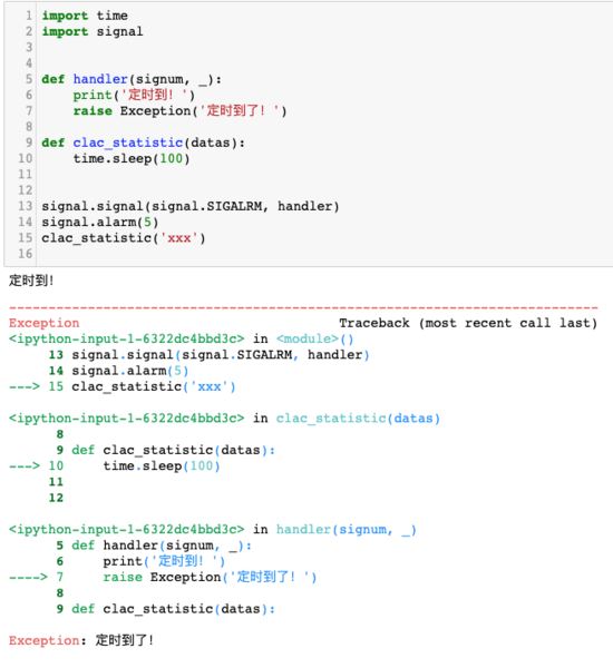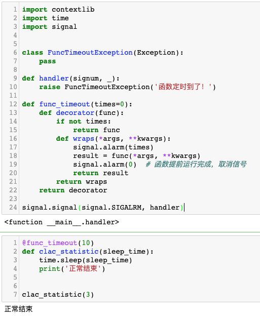 首先绑定 signal.SIGALRM 事件到 handler 函数中,然后使用 signal.alarm(10) 延迟10秒发送一个信号。10秒到了以后,函数 handler 被运行。在函数中抛出了一个异常,导致程序结束。 clac_statistic 函数原本要运行100秒,但是在10秒以后就停止了,从而实现了函数的超时功能。