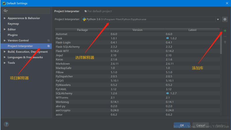 3、首先需要选择项目的解释器,然后在最右侧添加需要的第三方库