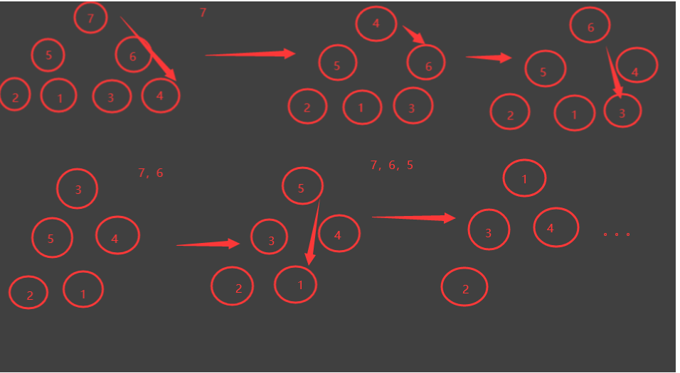 当已有最大堆,如下图,首先将7提出,然后将堆中最后一个元素放到顶点上,此时这个堆不满足最大堆了,那么我们要给它构建成最大堆,需要找到此时堆中对打元素然后交换,此时最大值为6,符合最大堆后,我们将6提取出来,然后将堆中最后一个元素放到堆的顶部...以此类推。最后提取的数值7,6,5,4,3,2,1