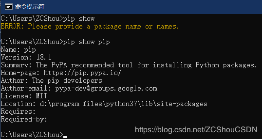 显示包所在目录及信息,格式为:pip show <包名>。如果不加包名,则提示ERROR: Please provide a package name or names.。