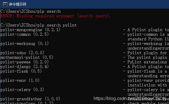 搜索包,格式为:pip search <搜索关键字>。如果不写关键字,则提示ERROR: Missing required argument (search query).。