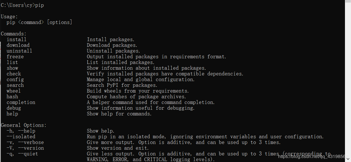 输入 pip ,点击Enter,出现以下界面则表示,你的 pip 已经配置好环境,可用