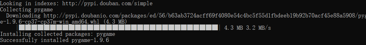然后输入以下命令,则可以使用豆瓣源安装pygame库pip install pygame -i http://pypi.douban.com/simple/