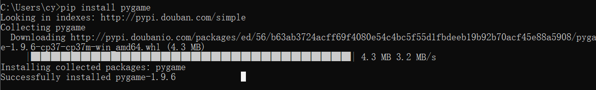 例如:直接输入pip install pygame就自动从 豆瓣源 下载