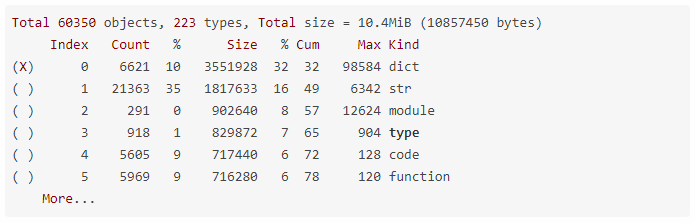 有很多工具可以分析和导出Python程序的内存状态。在这里,我们使用pyrasite,它可以附加到正在运行的Python程序,生成内存快照,并检查当前哪些对象类型占用了多少内存,并从大到小排序。